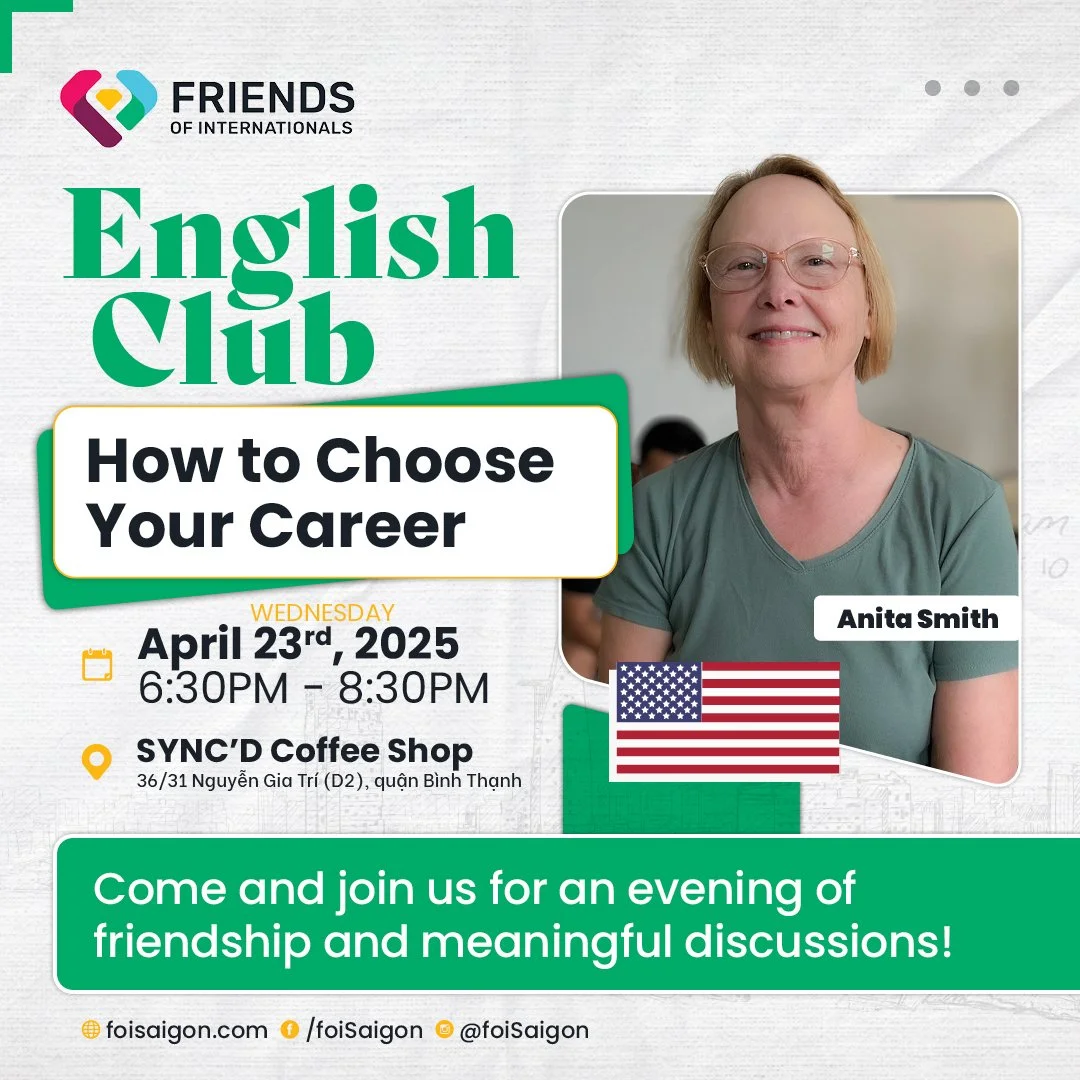 Back to All Events English Club - April 23 Wednesday, April 23, 2025 6:30 PM 8:30 PM Sync'd Coffee 36/31 Nguyễn Gia Trí Hồ Chí Minh Vietnam (map) Google Calendar ICS marginwidth="0">Loading…