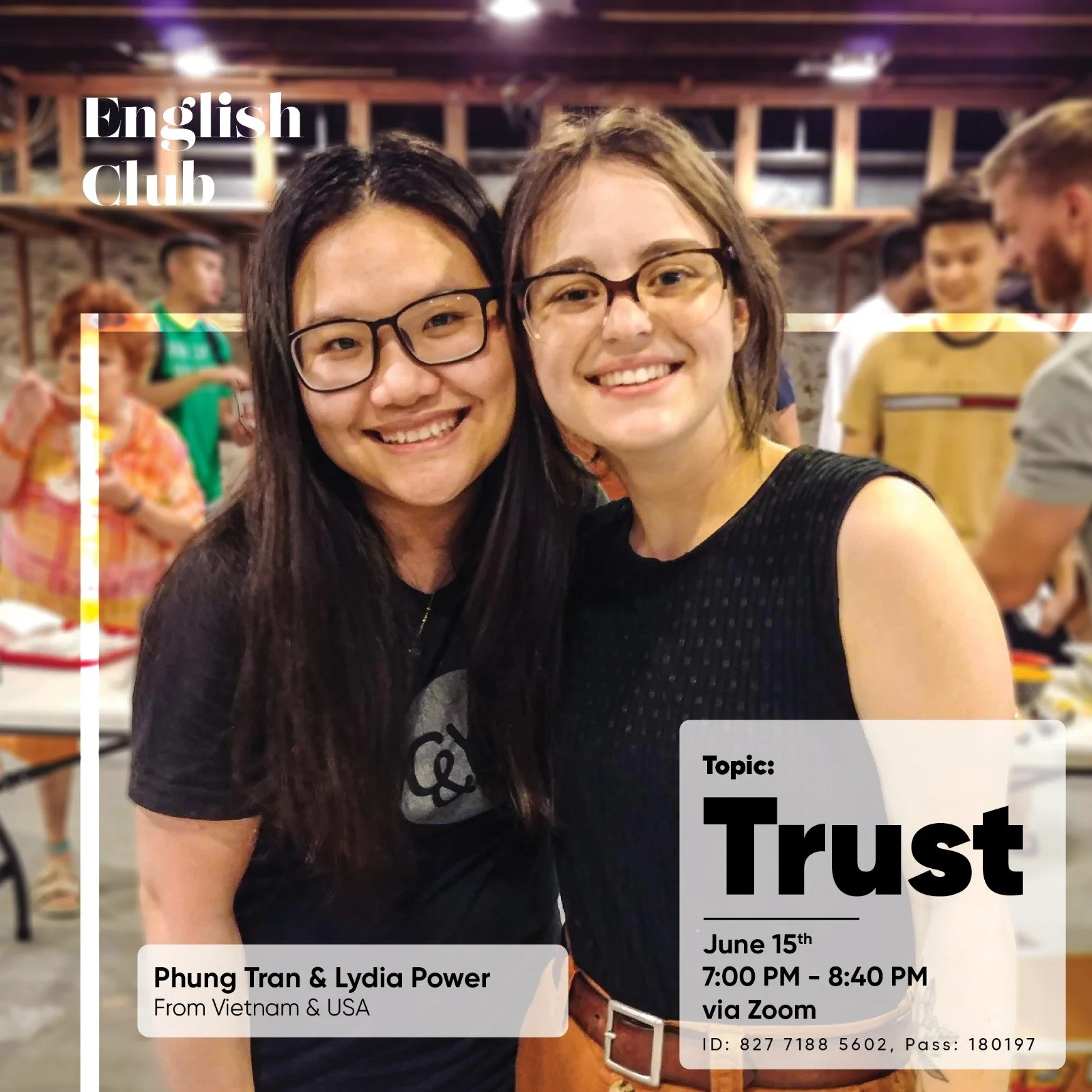 Join us on Wednesday, June 15 for our English Club event titled “Trust”. Our topic will be presented by our speakers from Vietnam & USA. Phung has a Master's Degree in Business Administration. Lydia has a Bachelor's Degree in Franch. Also, this is an excellent time to practice English and meet new friends.