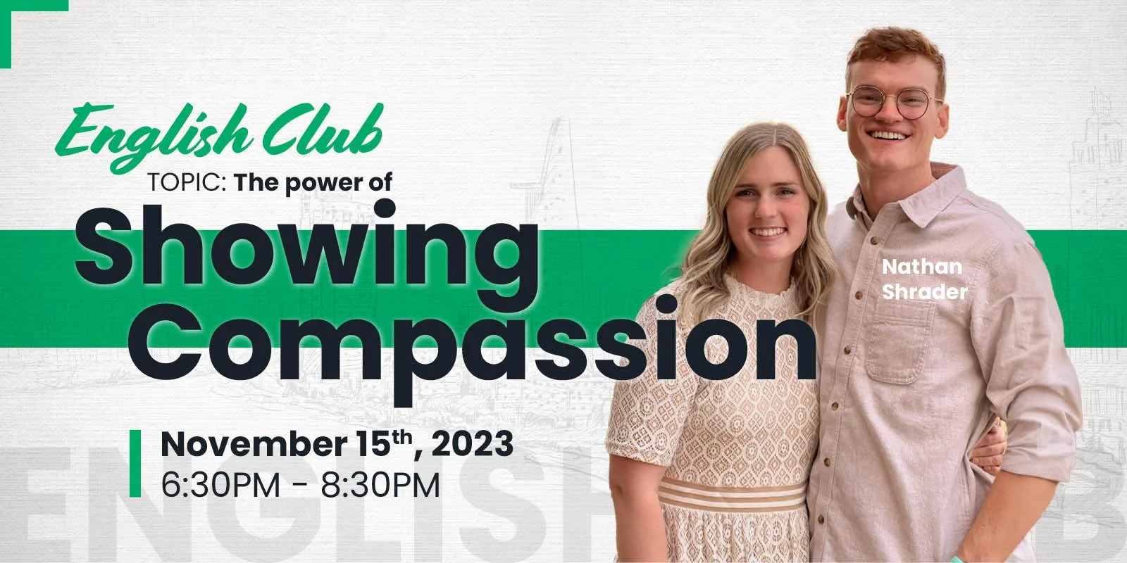 English Club. 11/15/2023. 6:30-8:30pm Topic: The power of Showing Compassion Guest Speaker: Nathan Shrader Location: SYNC'D Coffee Shop Address: 36/31 Nguyễn Gia Trí (D2), quận Bình Thạnh https://goo.gl/maps/nBJZWHUSFEG4EetM9 Entry Fee: 20.000 VND (You don’t have to buy any drinks at the coffee shop)